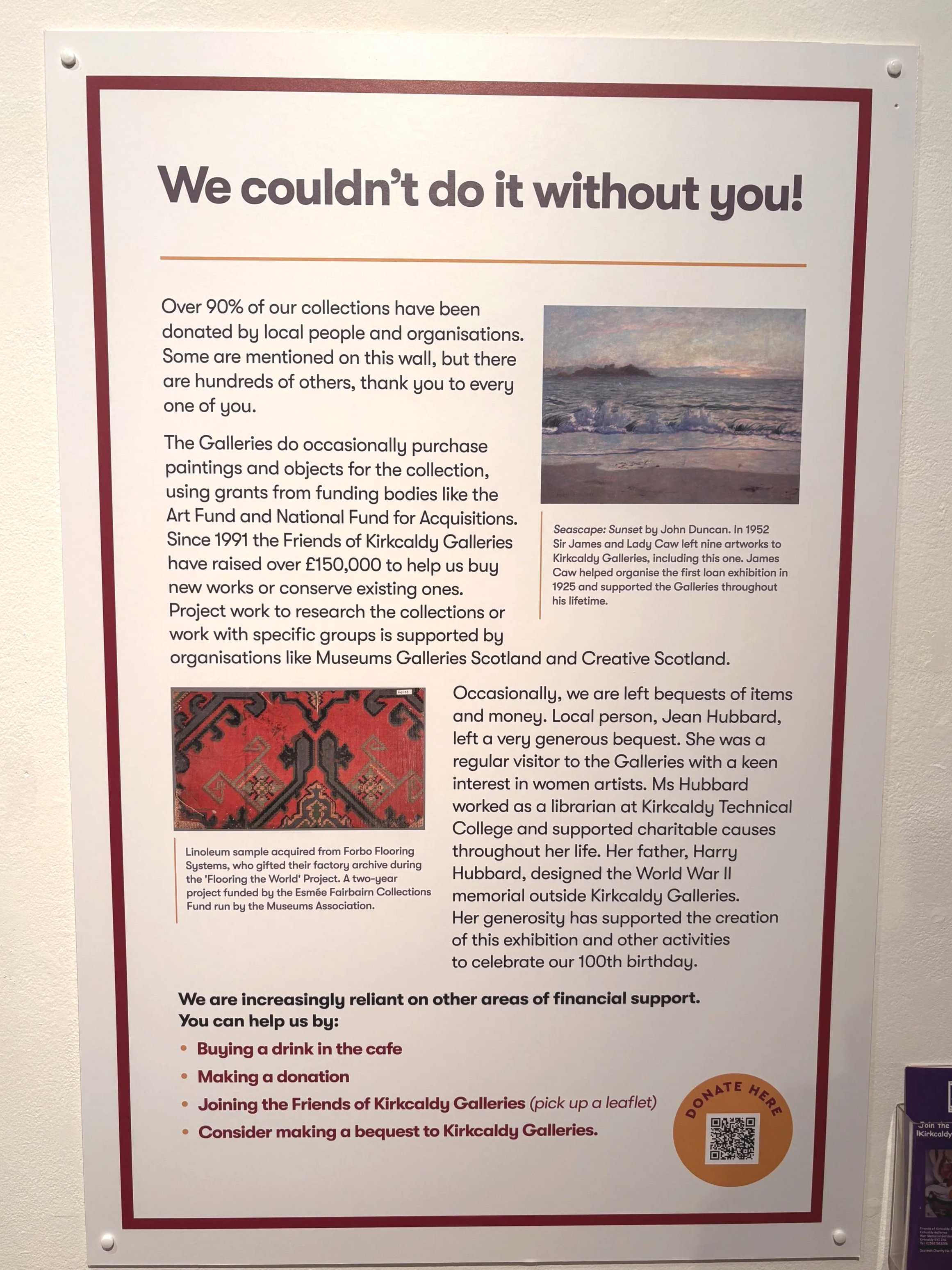 Kirkcaldy Galleries & Museum exists today thanks to John Nairn of the Nairn family, whose industrial work in linoleum is part of the town’s history. Nairn was also a dedicated art collector, and his vision and funding led to the creation of the galleries in 1925 as a memorial following the First World War. Nairn sadly lost his son only weeks before the end on the war. He contributed works from his own collection to establish the galleries’ early exhibitions. On the wall in the first room is a quote from Nairn that says the Galleries/Museum was ‘gifted in the hope that it would stimulate other public-spirited acts’. A century later, the galleries continue to be a cultural anchor in the town. I highly recommend every Fifer to visit at least once.