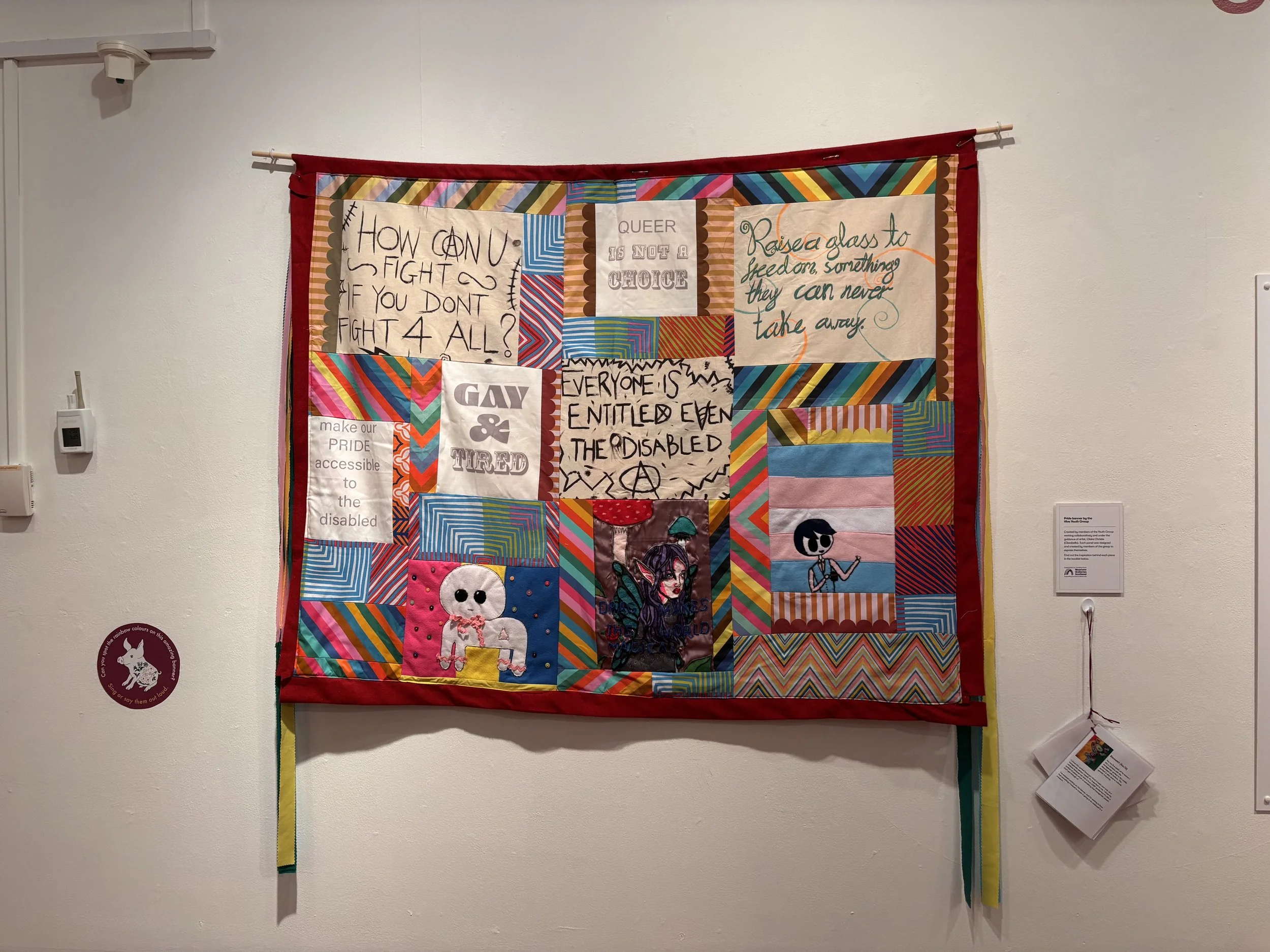 This became particularly evident when we encountered a collaborative textile banner created by The Hive in Kirkcaldy and local artist, Claire Christie. The Hive is a local LGBTQ+ community space located on Whytescauseway. Initially passed over, the curator returned to discuss it, acknowledging its emotional significance while noting that it was not regarded at the same level as other works. This highlighted the ongoing hierarchy that places certain media, such as textiles and digital art, beneath traditional forms in terms of perceived value.