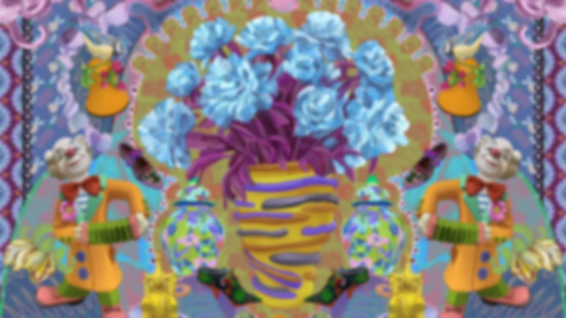 Centred on a handmade, slightly wonky vase, this composition is flanked by two accordion-playing clowns, bringing a sense of character and symmetry.