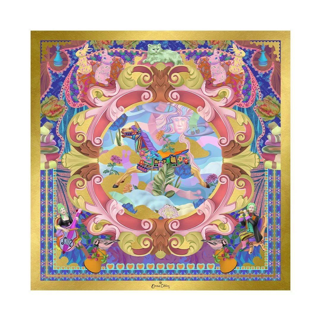 A standout piece within the series, finished with gold foil and centred on a carousel horse framed in ornate detail. Surrounding elements include: chess pieces, animals, and gathered objects which create a sense of richness and layering.