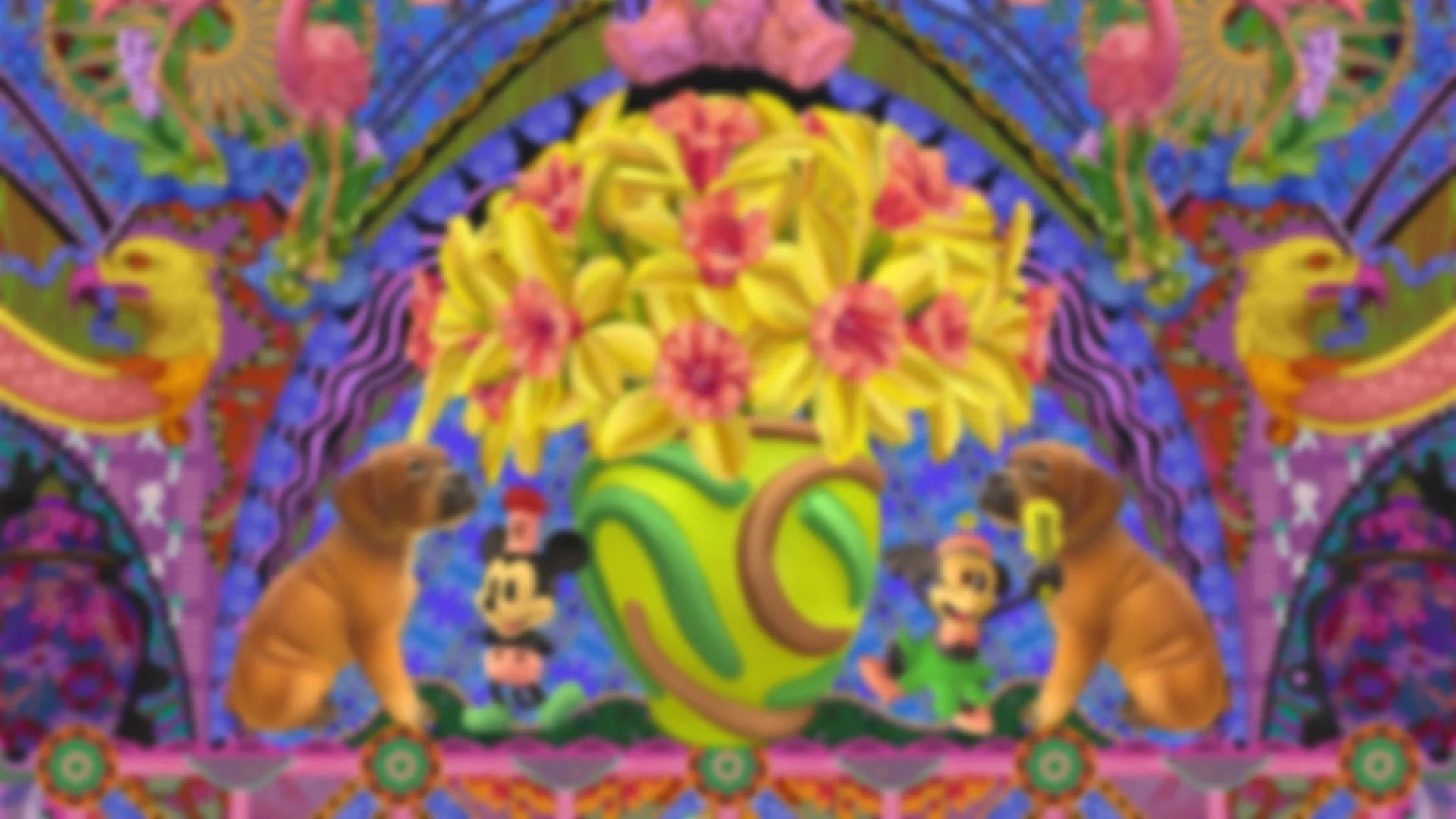 Set against a black background, this composition centres on a yellow vase of daffodils. It features playful characters and motifs emerging around it with figures, animals, and familiar forms.
