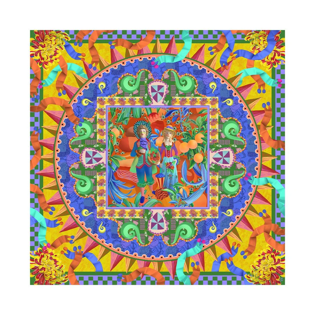 A vibrant composition inspired by sunlit interiors and decorative tilework, centred on a square pattern featuring the Sweethearts standing among orange trees.