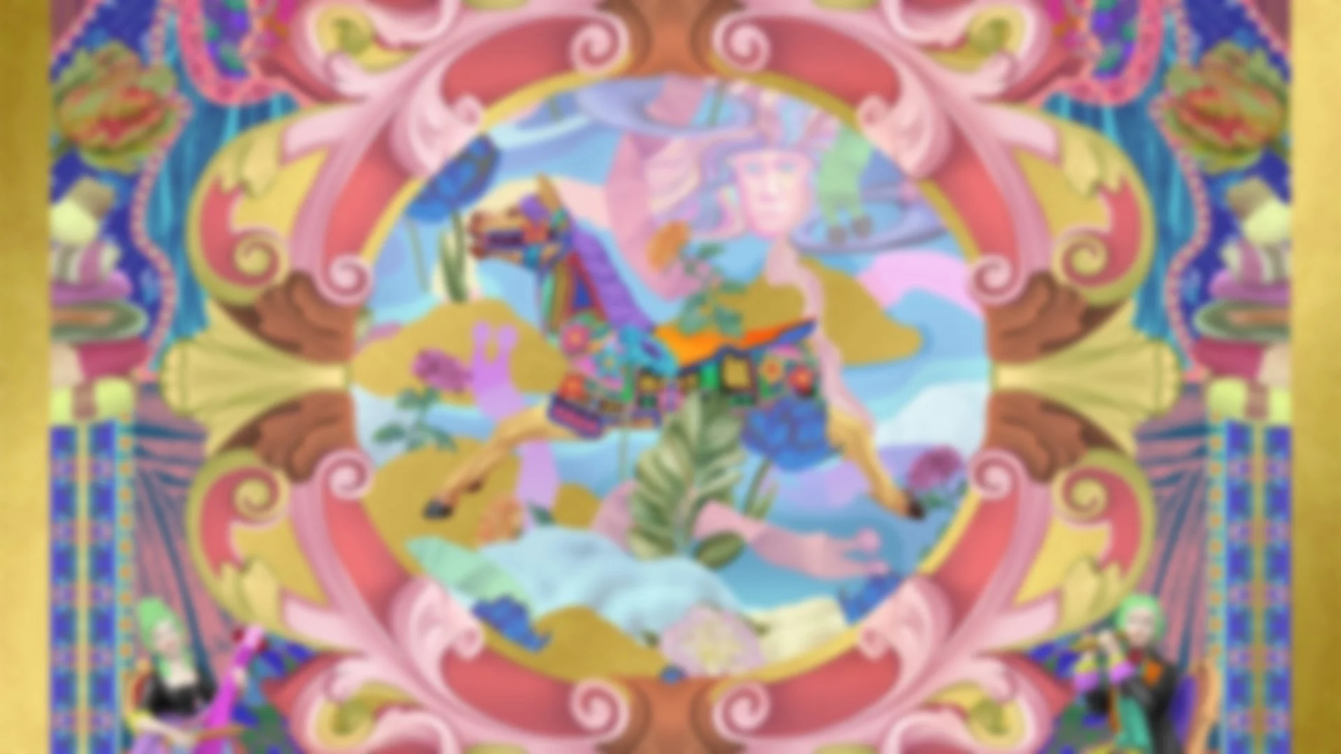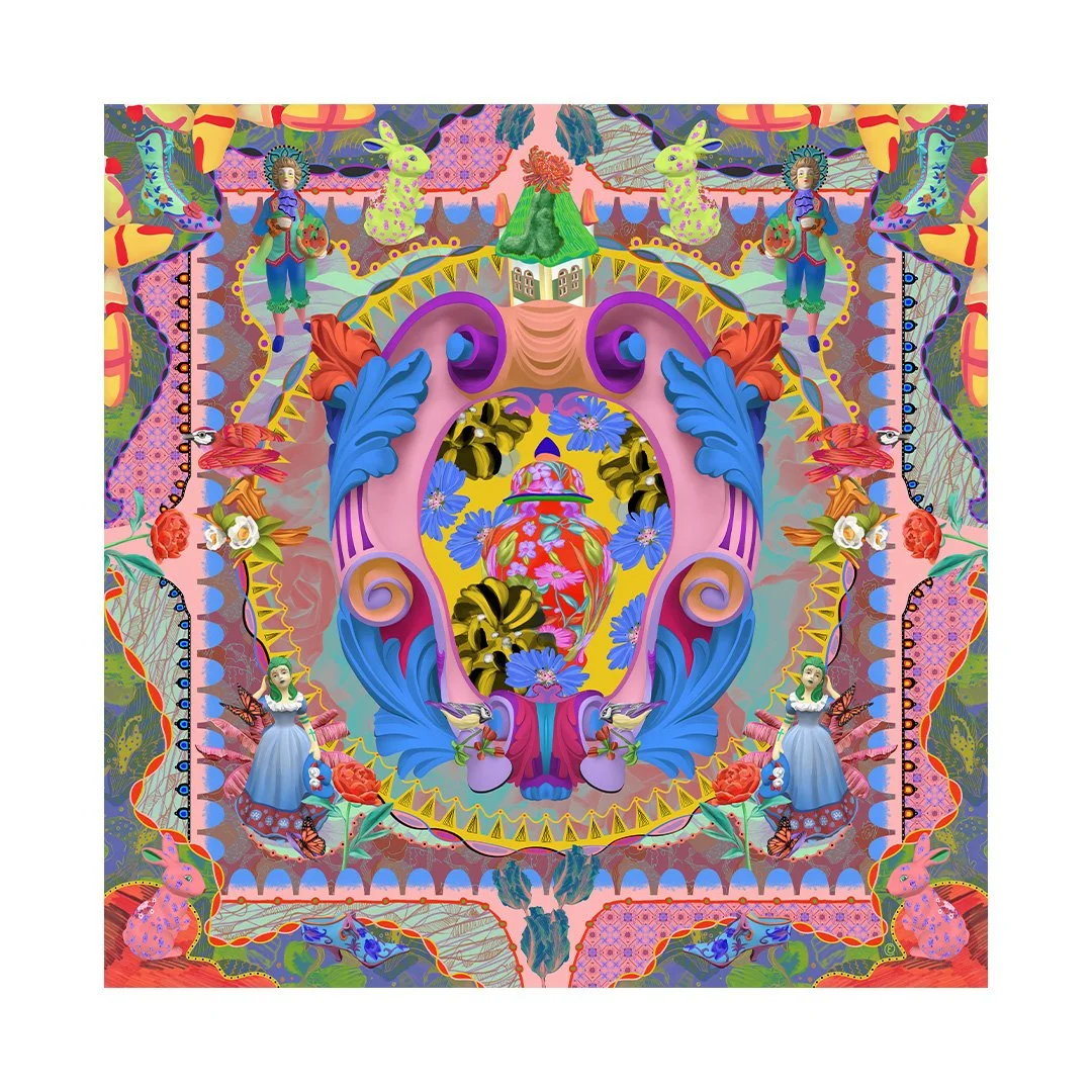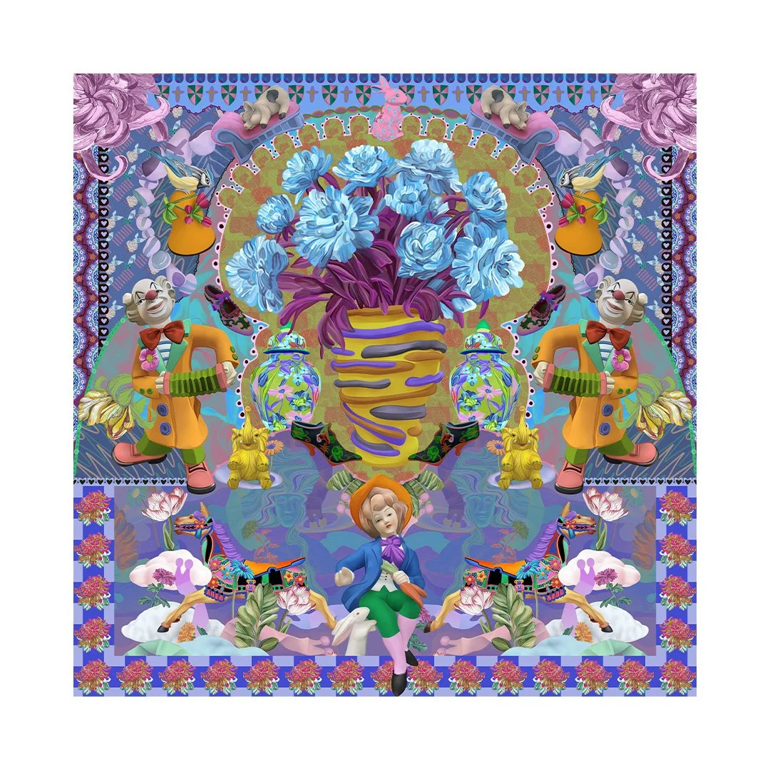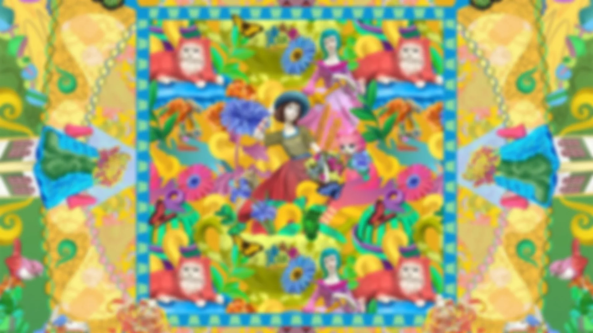 Built around a central golden pattern inspired by found objects, this piece weaves together playful and nostalgic elements. There are carousel horses, butterfly-headed figures, and red cats resting on blue cushions.