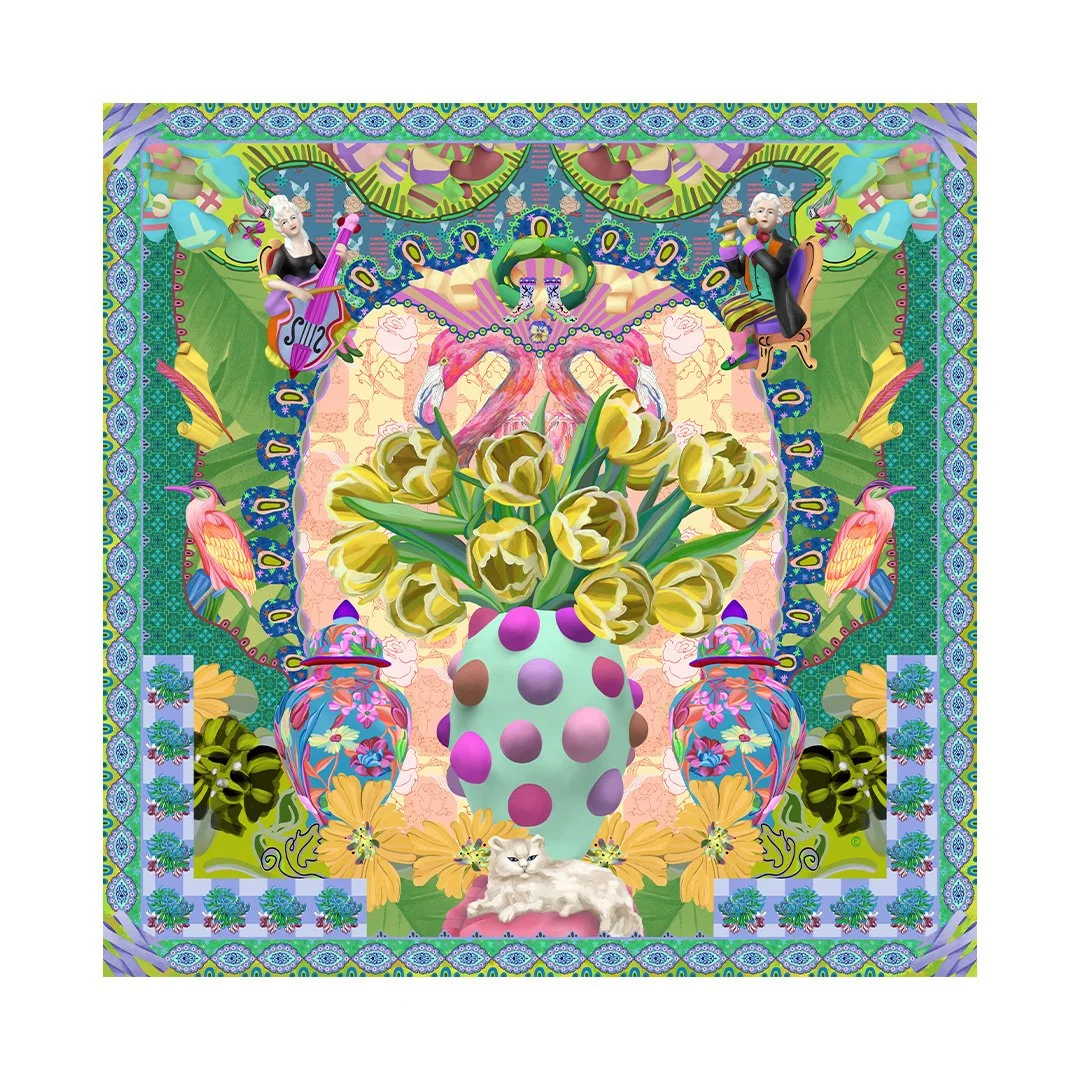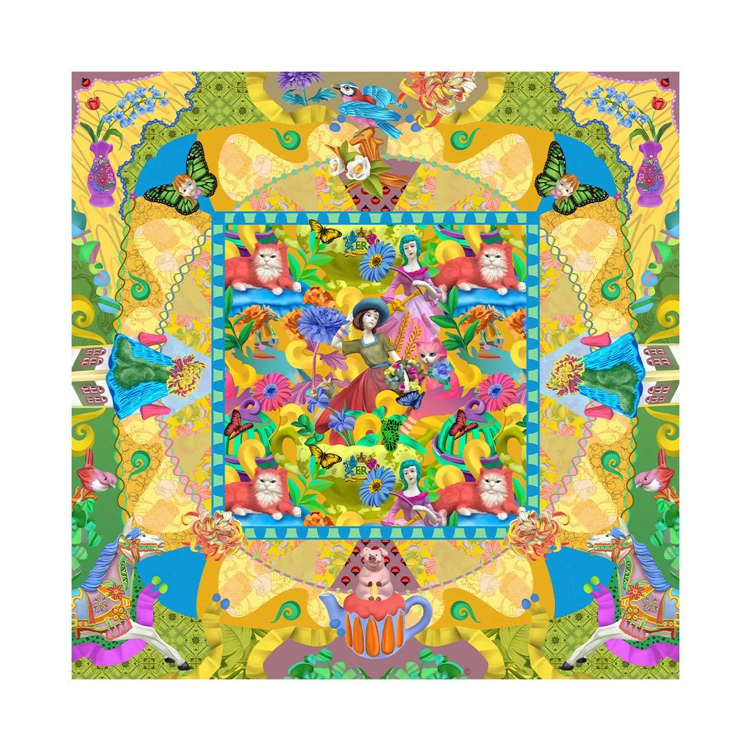 Soft yellows, greens, and blues create a light, summery palette, with layered detail encouraging a slower gaze.