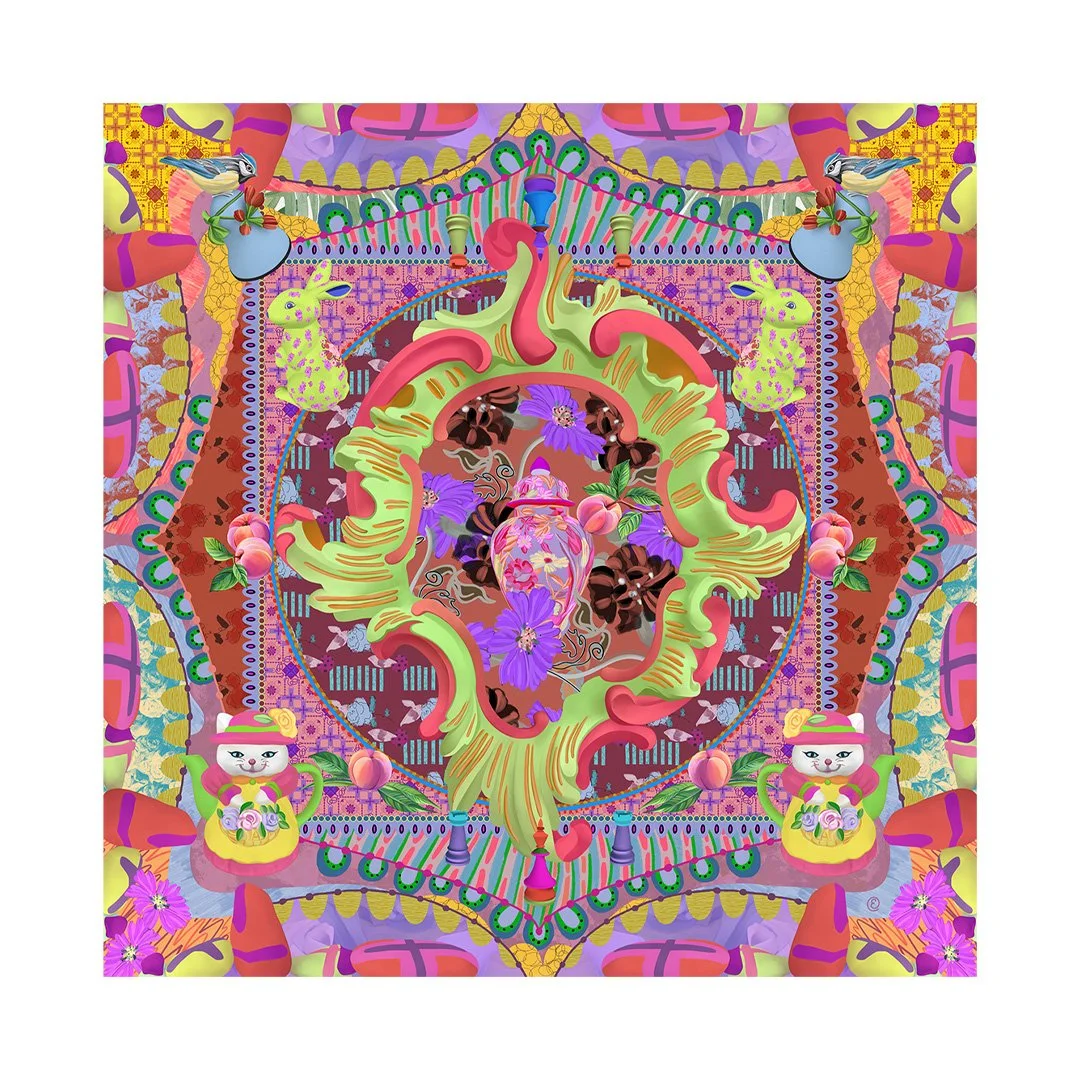 A richly detailed composition centred around a cherished ginger jar, framed in intricate ornament. A recurring character, the little yellow bunny is accompanied by ripe peaches.