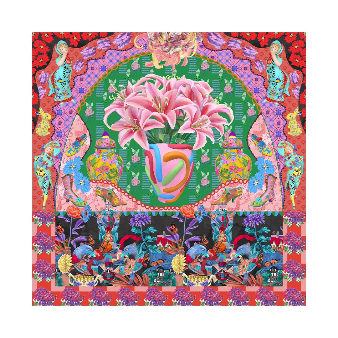 Centred on a handmade vase of pink lilies, this composition brings together familiar objects like ginger jars, a paired couple, ornate shoes, and small, scattered treasures.